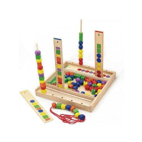 | Karakteristike | Set sadrži kutiju/bazu na koju se postavlja 5 panela sa zadatim obrascima za ređanje perlica vertikalno na postavljene štapove, prepoznavajući perle po obliku i boji. Pakovanje sadži: 72 drvene perlice, 10 panela sa zadacima, 10 štapova za ređanje i 2 pertlice za nizanje perlica. Dim: 33.5x33x4 cm. |